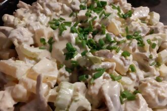 Verwerte die Reste deines Truthahns auf köstliche Art und Weise mit diesem einfachen Geflügelsalat-Rezept. Die Fleischreste werden mit frischem Stangensellerie und Ananas aus der Dose kombiniert und mit einem hausgemachten Miracle Whip-Dressing verfeinert. Die angerösteten Sonnenblumenkerne und Schnittlauch sorgen für zusätzlichen Geschmack und Knusprigkeit. Dieses Gericht ist perfekt für ein schnelles Mittagessen oder als Beilage zu einem Abendessen.