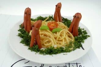 5. Danach aus Nelken die Augen dekorieren und mit den Spaghetti anrichten.
