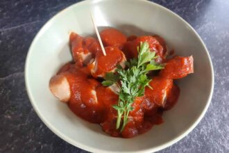 - Die Wurst in Scheiben scheiden, in Schalen portionieren und die Curry-Soße drüber geben