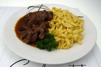 Rotwein-Gulasch ist ein würziges und herzhaftes Gericht, das mit Putengulasch, einer großen roten Zwiebel, Rotwein, Brühe und Tomatenmark zubereitet wird. Es schmeckt am besten mit Semmelknödeln oder Spätzle und Rotkohl und ist ein Garant für Begeisterung bei Familie und Gästen.